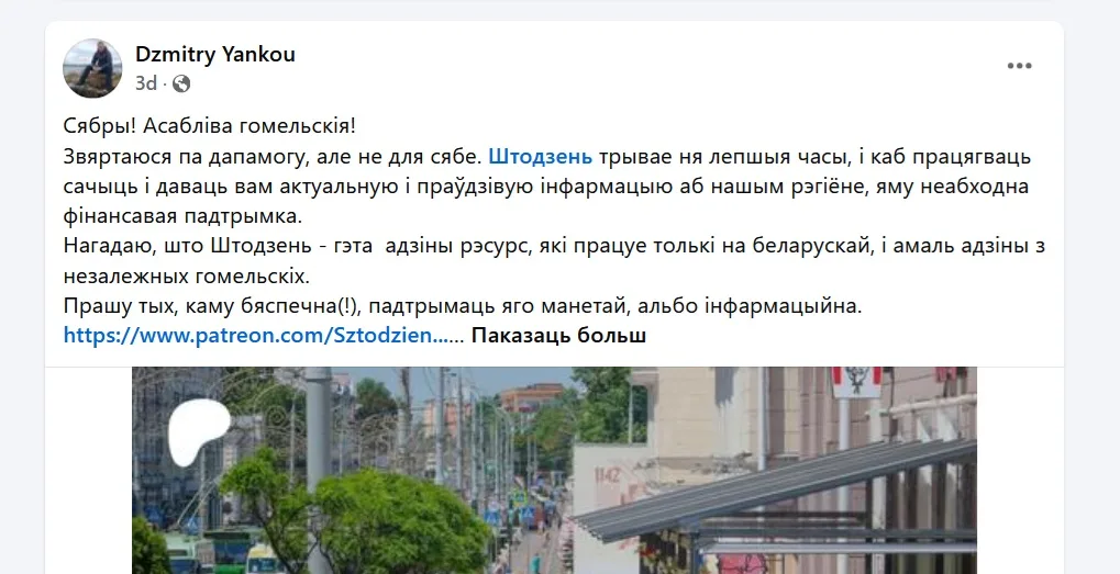 «Сябры! Асабліва гомельскія! Звяртаюся па дапамогу, але не для сябе. Штодзень трывае не лепшыя часы, і каб працягваць сачыць і даваць вам актуальную і праўдзівую інфармацыю аб нашым рэгіёне, яму неабходна фінансавая падтрымка. Нагадаю, што Штодзень – гэта адзіны рэсурс, які працуе толькі на беларускай, і амаль адзіны з незалежных гомельскіх. Прашу тых, каму бяспечна(!), падтрымаць яго манетай, альбо інфармацыйна…»