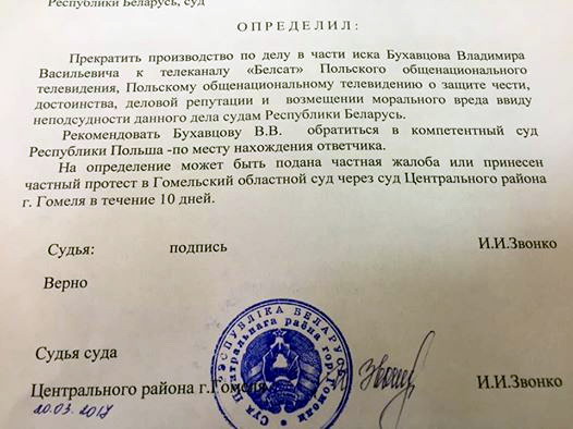 У Цэнтральным судзе Гомлю справу супраць «Белсату» спынілі праз «непадсуднасць», бо тэлеканал застаецца замежнай юрыдычнай асобаю. Да фрылансера Кастуся Жукоўскага таксама не маюць прэтэнзіяў, бо, паводле рашэння суда, звесткі, на якія спасылаўся пазоўнік, не ўтрымліваюцца ў сюжэце.