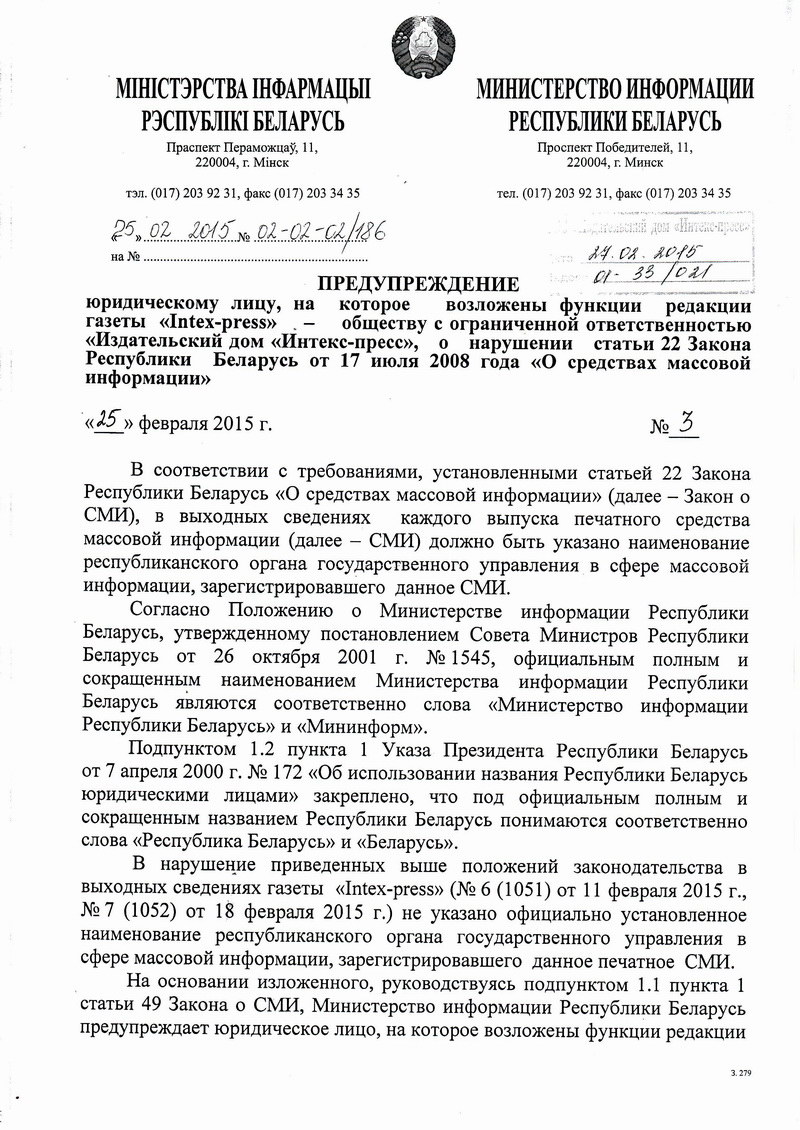 На дадзены момант вядома, што Міністэрства інфармацыі Беларусі вынесла папярэджанні аб парушэнні закона “Аб СМІ” як мінімум тром рэдакцыям рэгіянальных выданняў: “Газеце Слонімскай”, “Intex-Press” у Баранавічах і “Ганцавіцкаму часу”.