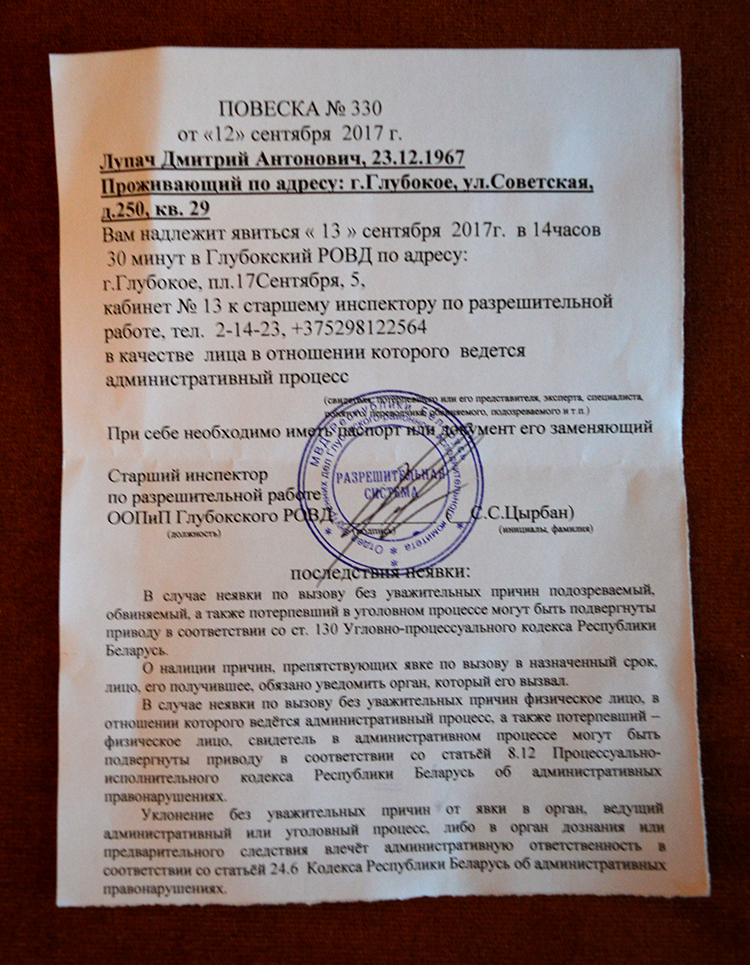 12 верасня вечарам глыбоцкі міліцыянт Сяргей Цырбан прынёс позву ў міліцыю Змітру Лупачу. У ёй яго просяць з’явіцца 13 верасня 2017 года а 14.30 у Глыбоцкі РАУС па адрасе: г. Глыбокае, пл. 17 Верасня, 5, кабінет №13 да старэйшага інспектара па дазвольнай працы.