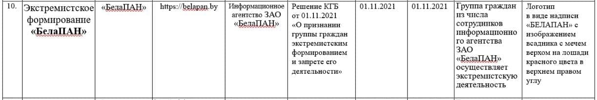 Агенцтва БелаПАН можна знайсці ў спісе экстрэмісцкіх фарміраванняў, апублікаваным на сайце МУС.