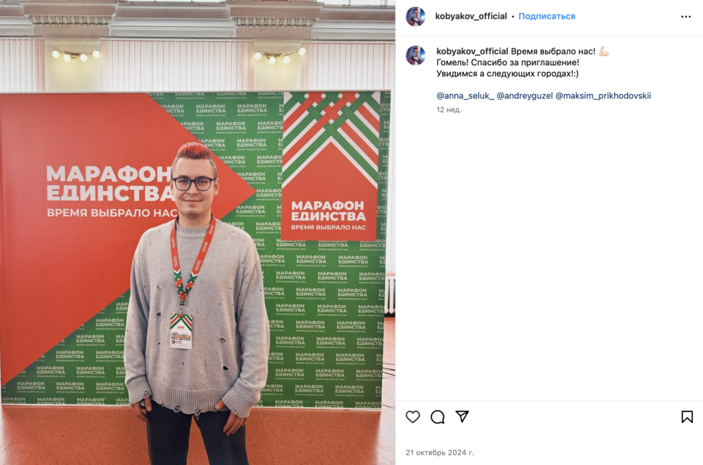 Экскурсію на «Гомсельмаш» блогер растлумачыў жаданнем «паболей даведацца пра зернеўборачныя камбайны». Але потым прызнаўся, што паўдзельнічаў у праўладным марафоне, і ва ўсіх фарбах распісаў «крутасць» мерапрыемства. Перад Новым годам яго як выканаўцу прыцягнулі і да выступу на гарадскіх святкаваннях у межах «Марафону адзінства».