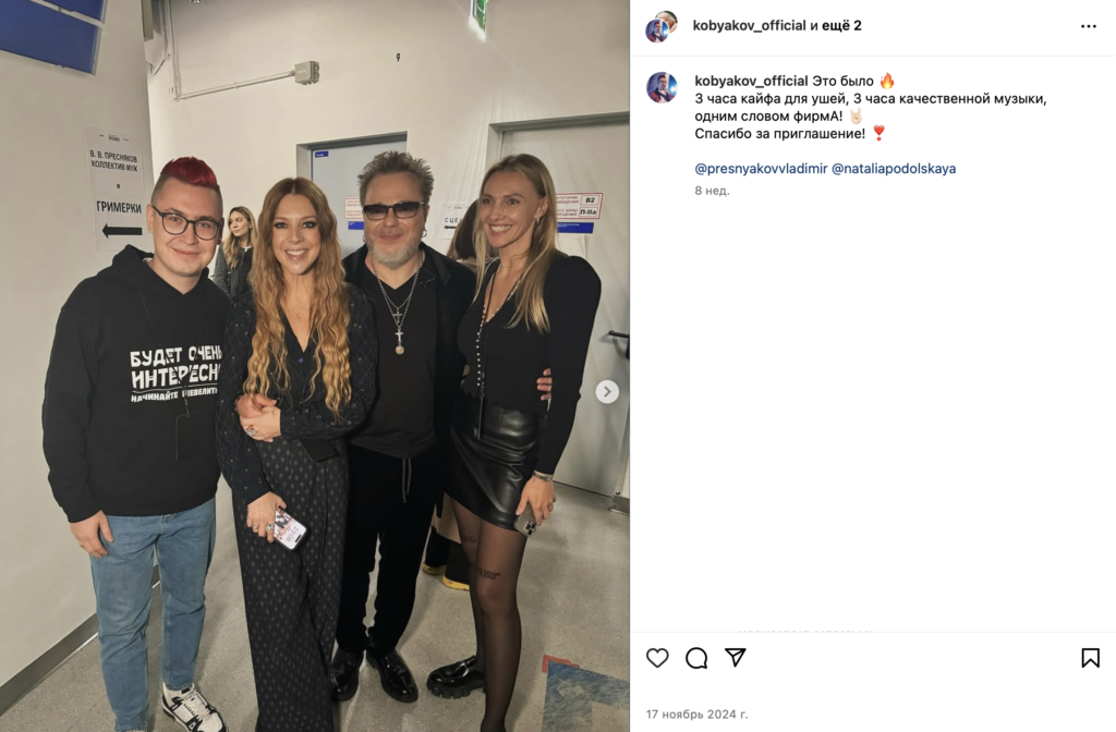 Улад Кабякоў (першы злева) у «мерчы першага». Крыніца: інстаграм-акаўнт @kobyakov_official