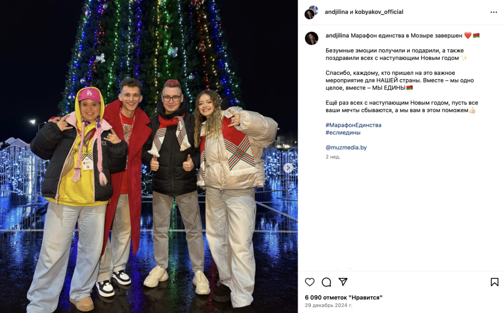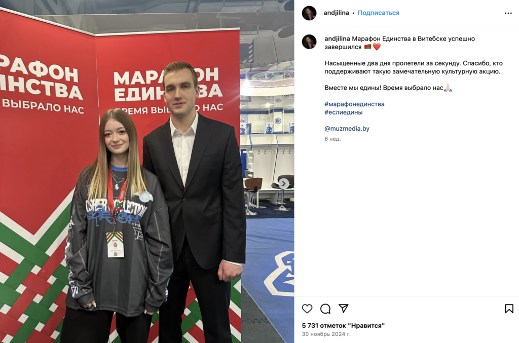 Ангеліна Міхалёва (Анджыліша) і Мікалай Лукашэнка на «Марафоне адзінства». Крыніца: інстаграм-акаўнт @andjilina