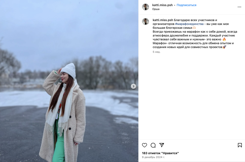 Яна мае ўсяго 11,8 тысячы падпісчыкаў у «Інстаграме», затое яна пілуе кантэнт з «Марафону адзінства» аўтаматнай чаргой. У яе сацсетцы мы знайшлі дзясяткі пастоў і сотні сторыс з падрабязнымі аглядамі з беларускіх прадпрыемстваў, якія яна наведвала ў межах акцыі, відэа з акцыі, відэа з канцэртаў у цэхах і «Час абраў нас», інтэрв’ю дзяржвыданням, фатаграфій з прапагандыстамі і зоркамі айчыннай эстрады.