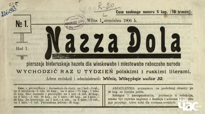 Пачатак ХХ стагоддзя стаў залатым перыядам беларускага нацыянальнага адраджэння. У сярэдзіне верасня 1906 года свет пабачыла першая беларуская газета: «Наша Доля». І няхай надрукаваць атрымалася ўсяго некалькі нумароў, след яна пакінула па сабе вечны.