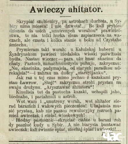 «Усім добра вядома, што няма горш жыцьця, як мужыцкае жыцьцё. Працуй цяжка не пакладаючы рук, пакуль маеш хоць крыху сілы, і за гэта цярпі голад і холад, жыві ў зьдзеку, паняверцы ды цямноце – во доля мужыка. І працуе мужык, сьцяўшы зубы, бо ведае, што інакш чакае яго галодная сьмерць. А тым часам бачыць ён, што шмат людзей каля яго жыве без усялякай працы ў багацьці і збытках, не знае ні гора ні бед.