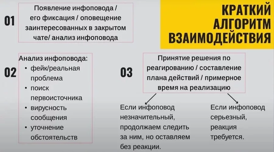Пасля аналізу інфармацыі выпрацоўваюцца варыянты рэакцыі. Гэта можа быць ці «ўдар на апярэджанне», ці «перахоп інфармацыйнага парадку дня».