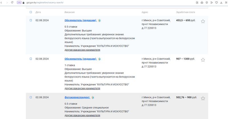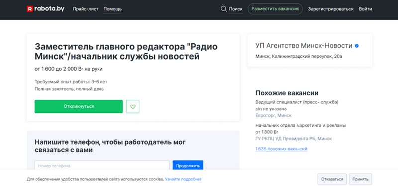 А вось агенцтва «Мінск-Навіны» шукае намесніка галоўнага рэдактара «Радио Минск» — начальніка службы навінаў. Заробкі трохі большыя (1600—2000 тысячы рублёў на рукі), але і патрабуемы вопыт працы вышэйшы — 3–6 гадоў.