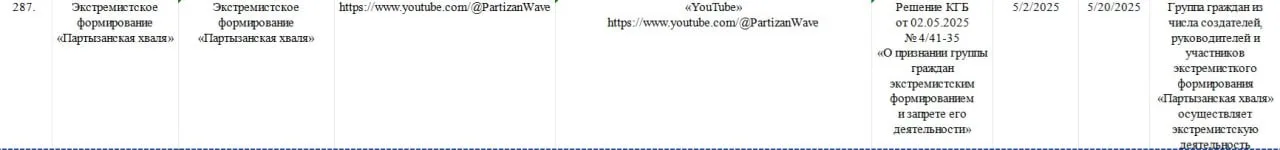 З пераліку, які складае на сваім сайце МУС Беларусі, вынікае, што рашэнне прызнаць YouTube-канал «Партызанская хваля» (ідэнтыфікатар youtube.com/@PartizanWave) «экстрэмісцкім фармаваннем» прыняў 2 траўня 2025 года Камітэт дзяржбяспекі Беларусі. Рашэнне ўступіла ў сілу ў той жа дзень.