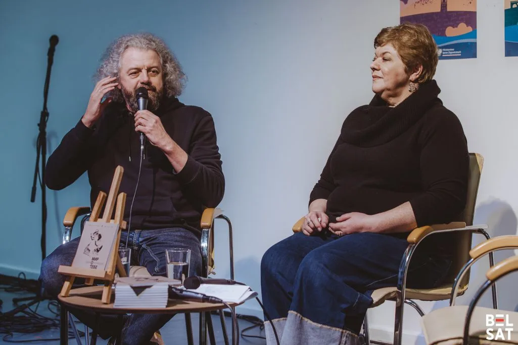 Юлія Чарняўская і паэт Андрэй Хадановіч падчас прэзентацыя кнігі вершаў «Мир о тебе» Юліі Чарняўскай у рамках фестывалю інтэлектуальнай кнігі PRADMOVA. Варшава, Польшча, 17 Лістапада 2024 года. Фота: Белсат