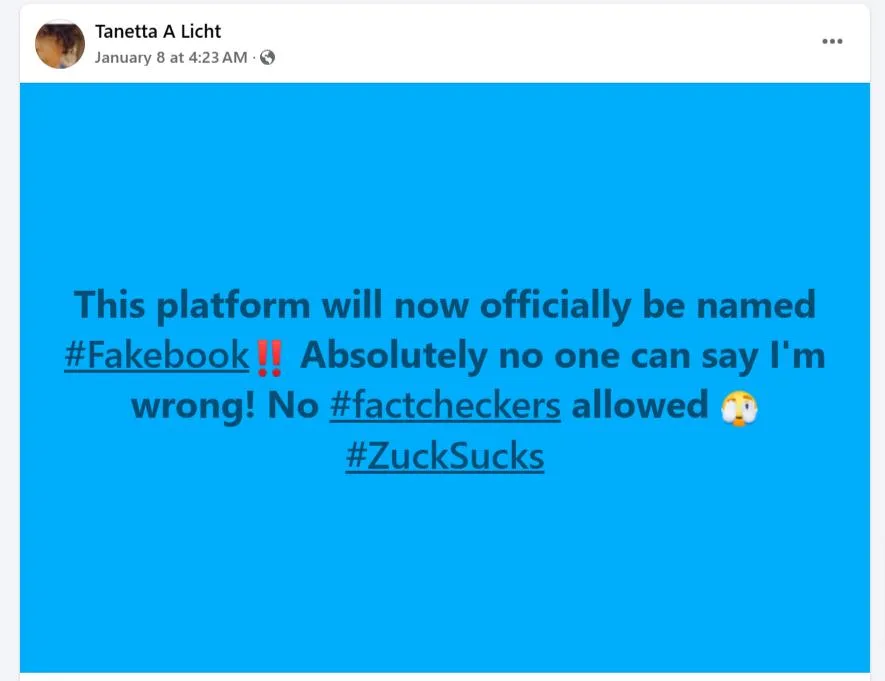 После того как пользователи стали жаловаться на чрезмерное вмешательство в их свободу выражения, Meta начала расширять функции автоматической модерации. Но теперь и от этого решено отказаться. 7 января 2025 года основатель Facebook Марк Цукерберг объявил о решении прекратить сотрудничество с фактчекерами, работающими над проверкой контента на платформах Meta в США (пока анонсированы изменения лишь на родине корпорации). В своём заявлении Цукерберг пояснил, что соцсети больше не должны быть арбитрами правды, призванными оценивать достоверность постов пользователей: