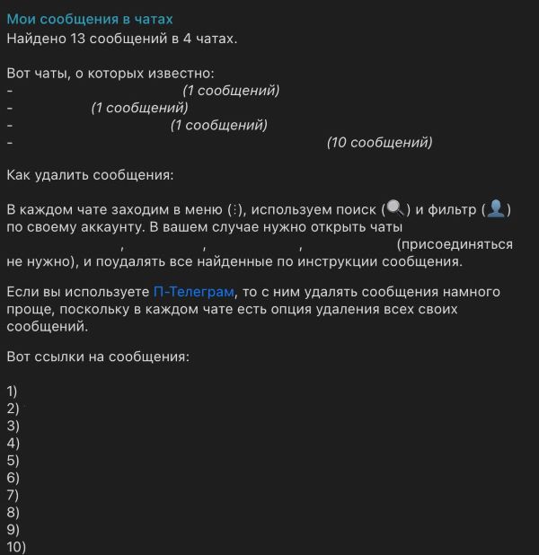 По истечении указанного времени пользователь получает от бота уведомление о количестве найденных в чатах сообщений и инструкцией о том, как их удалить.