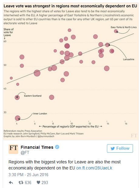 Перевод: Регионы, в которых наибольшее количество людей проголосовало за выход, экономически наиболее зависимы от ЕС