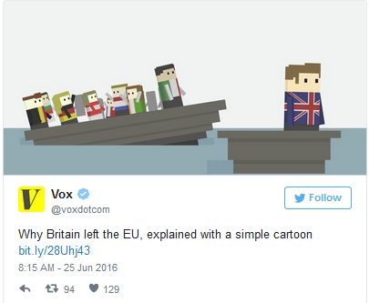 Веб-сайт Vox представил своим читателям голосование Brex­it с помощью карикатур, а The Wall Street Jour­nal создал обновляющуюся в режиме реального времени карту.