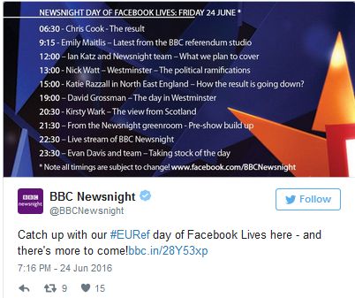 BBC использовала Face­book Live, освещая тему Brex­it на следующий день после референдума: программа включала репортажи с места событий, а журналисты отвечали на вопросы зрителей через Face­book. Online Jour­nal­ism Blog отметил, что BBC, по сути дела, вела «собственный 24-часовой телевизионный канал» и продемонстрировала «как новостная программа может обойти ограничения, связанные с выходом в эфир. Нет необходимости ни в дорогой студии, ни в установке света, ни в макияже: только журналист и веб-камера».