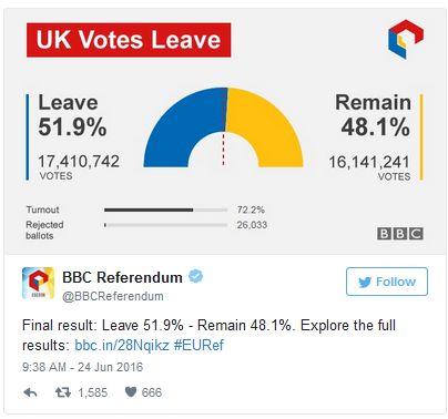 Перевод: Окончательный результат: выйти 51,9% – остаться 48,1%. С более подробной информацией можно ознакомиться здесь: http://bbc.in/28Nqikz #EURef