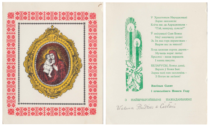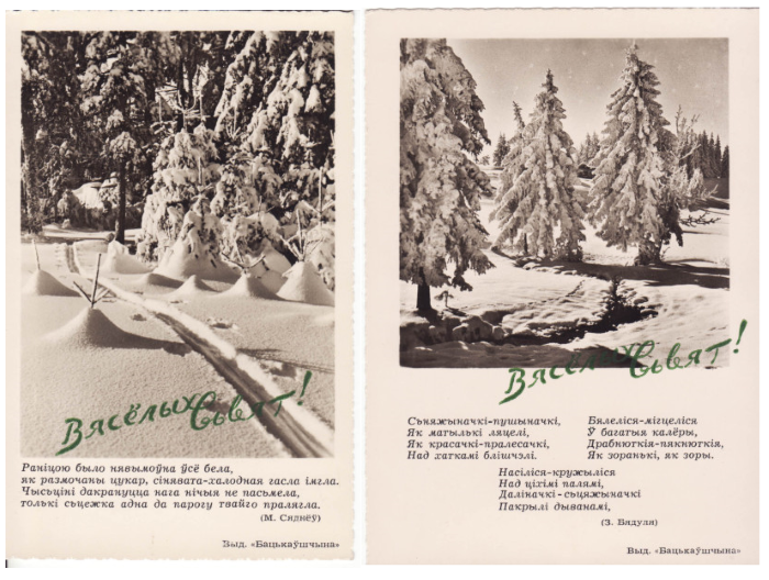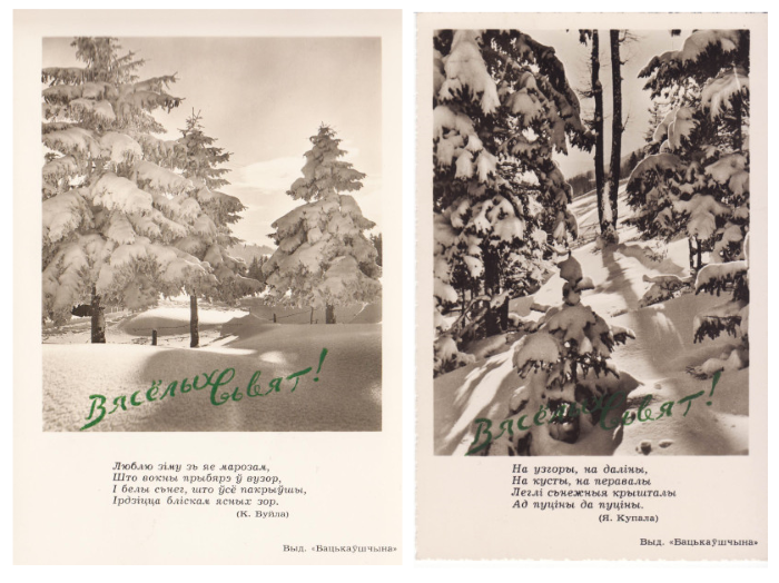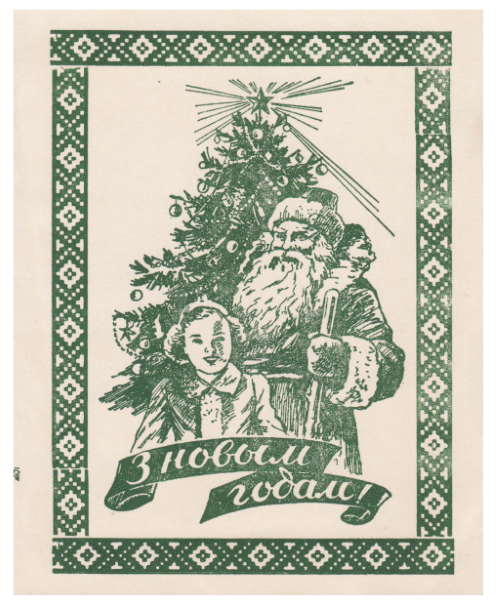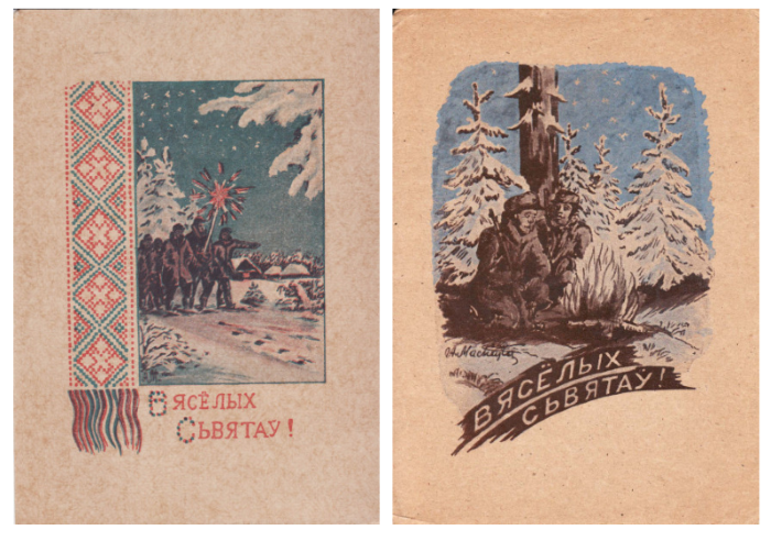 З іншага боку — паштоўка з Дзедам Марозам ды ялінкай, на версе якой — чырвоная зорка. На першы погляд яна можа падацца «савецкай», але ў падобнай эстэтыцы ў часы нямецкага панавання 1941–1944 гг. у Беларусі выходзілі выданні для школьнікаў на калядную тэму. Свой, беларускі канон яшчэ не быў распрацаваны. З адметнага тут хіба рамка з нацыянальным арнаментам.