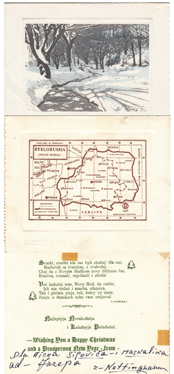 Яшчэ адна паштоўка была дасланая грэка-каталіцкаму святару Чэславу Сіповічу ад нейкага Язэпа з Нотынгема. Картка з зімовым сюжэтам, а ўсярэдзіне — мапа Беларусі ды купалаўскія радкі лацінкай. Гэтая ж мапа выкарыстоўвалася ў англамоўных брашурах пра Беларусь, каб тлумачыць замежнікам, што ж гэта за краіна. Можна меркаваць, што паштоўка мела падвойнае прызначэнне: і для брытанцаў, і для беларусаў. На мапе выяўлена «ідэальная» Беларусь з мяжой далёка за Смаленскам, а назва Расіі прадубляваная як «Масковія».