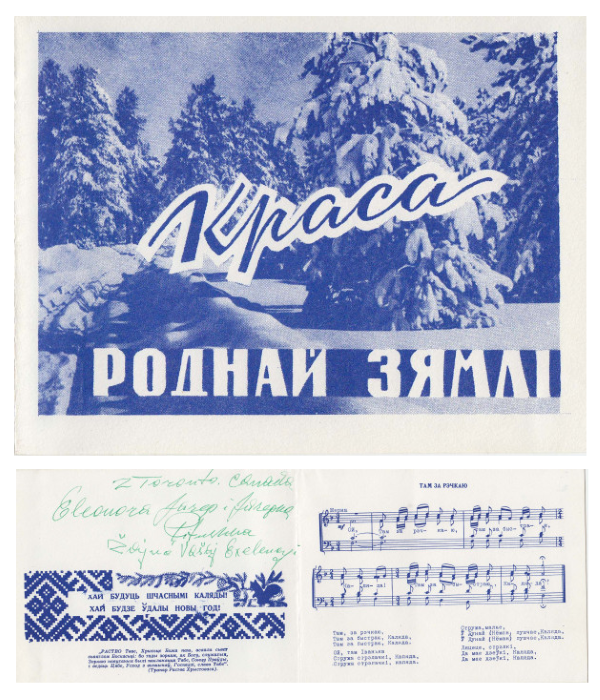 Да ліку «настальгічных» можна аднесці паштоўку з Канады з зімовым лесам і допісам «Краса роднай зямлі». Усярэдзіне — віншаванні, тэкст і ноты песні «Там, за рэчкаю» ды месца для асабістага подпісу. Фактычна, гэта ўжо складзены канон беларускай каляднай паваеннай паштоўкі на Захадзе: пажаданні + верш + арнамент + беларускі краявід.