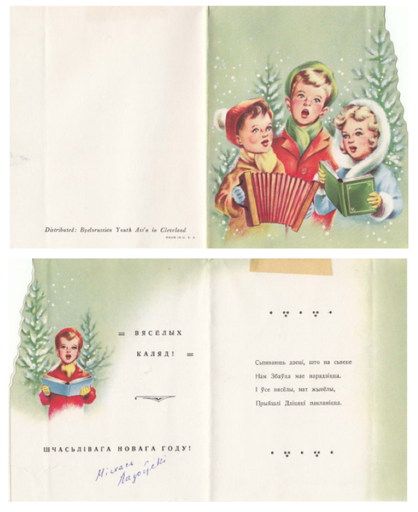 Паводле Наталлі Гардзіенкі, у 1950‑х галоўным цэнтрам выдання калядных паштовак сталі ЗША. Гэтым найбольш займалася Згуртаванне беларускай моладзі ў Кліўлендзе. Пасля лагераў DP вялікая колькасць эмігрантаў з’ехала з Заходняй Германіі за акіян, што дало новы штуршок культурным праектам. Тут бачым культурны сімбіёз: цалкам «амерыканскія» сюжэты, але аздобленыя беларускімі надпісамі.