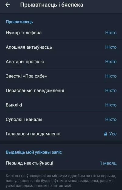 Па-першае, пераканайцеся, што ў вас выстаўленыя максімальныя налады прыватнасці. Для гэтага зайдзіце ў пункт «Прыватнасць і бяспека». Максімальныя налады прыватнасці выглядаюць так.
