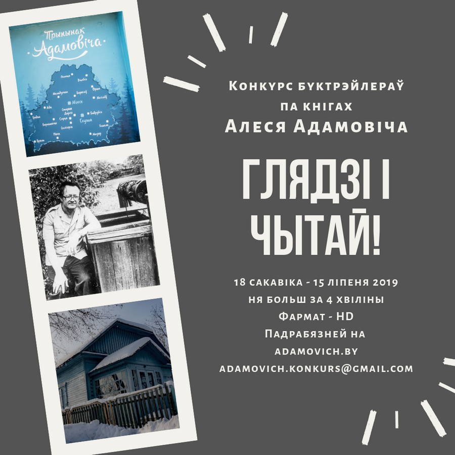 - Увосень 2019 года прыехаць на ўрачыстую прэзентацыю на малой радзіме Алеся Адамовіча ў Глушы, пазнаёміцца з аднадумцамі, атрымаць узнагароду і / ці парадаваццца за калег.