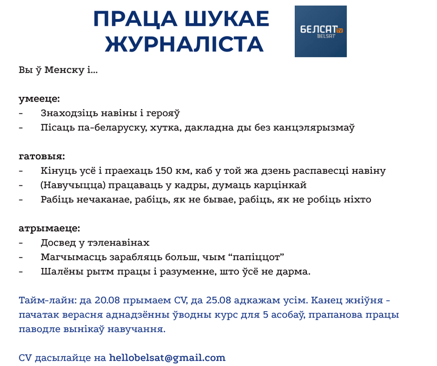 Тэлеканал Белсат шукае журналістаў і журналістак у Менску.
