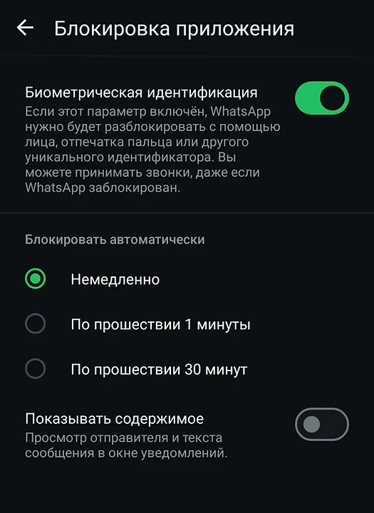 Кроме того, рекомендуем отключить параметр «Показывать содержимое», чтобы текст сообщений не всплывал даже при заблокированном приложении на экране смартфона.