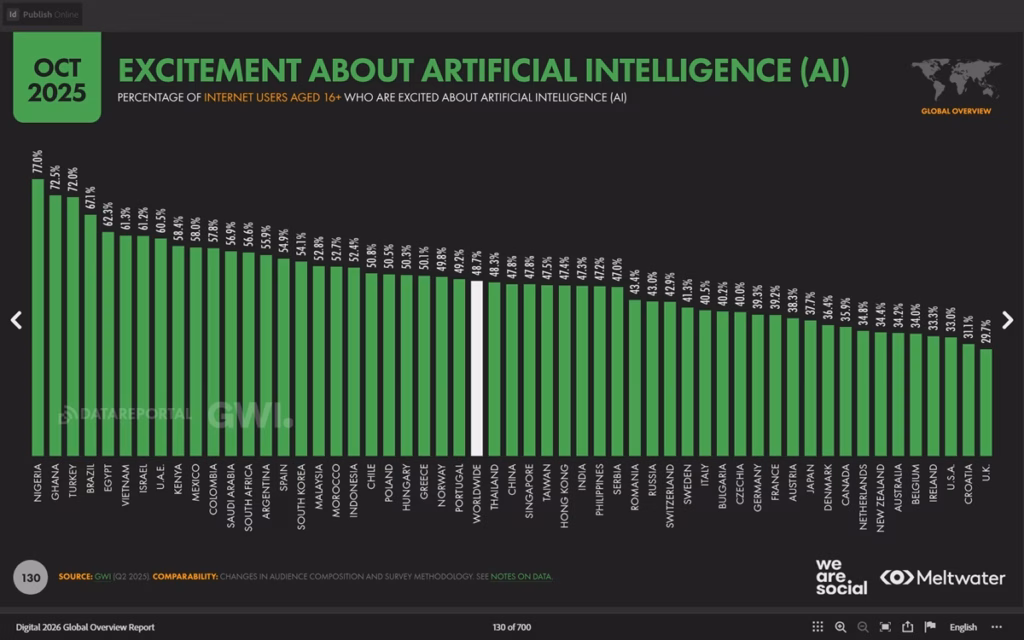 Процент интернет-пользователей 16+ воодушевлённых использованием ИИ / Инфографика Digital 2026 Global Overview Report