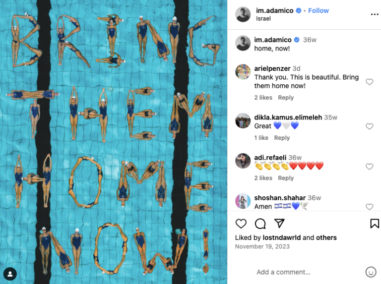 Подобный способ оказался действенным в случае с фото израильских спортсменов, выложивших в бассейне своими телами надпись «Bring Them Home Now». Она означала требование вернуть заложников, захваченных боевиками ХАМАС в октябре 2023 года. Пользователи утверждали: подобную композицию спортсмены выложили на Олимпиаде в Париже. Однако это не так: специалисты Reuters Fact Check связались с автором снимка, Адамом Шпигелем, и выяснили — фотоколлаж действительно был, но его сделали за год до игр, 17 ноября, в Израиле.