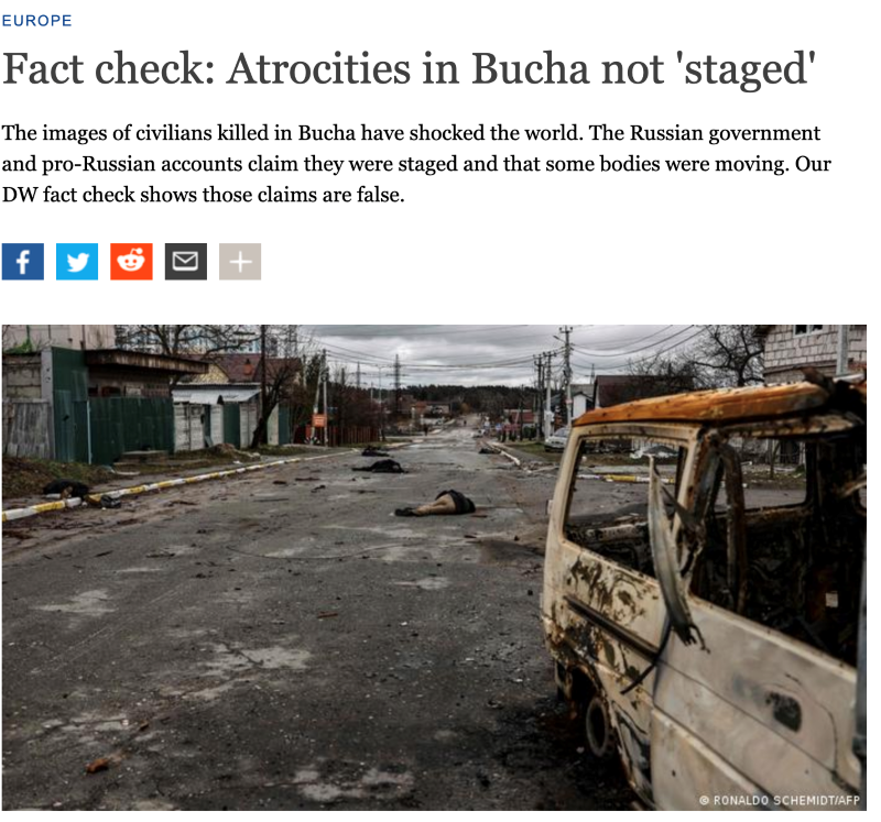 Немецкое издание Deutsche Welle (DW) — пример того, как система проверки может разоблачать действия тех, чья цель — нанести ущерб. В преддверии войны фактчекинговая команда DW начала составлять базу ложных утверждений и примеров пропаганды, которые распространяли обе стороны конфликта, и публиковать их опровержения. Они также сделали поразительное открытие: кто-то распространял ложную информацию от их имени.