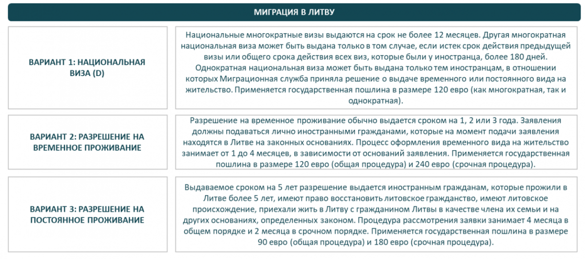 В таблице представлен обзор вариантов законного проживания в Литве.