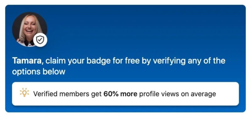 Linkedin предлагает верификацию профиля, даже если у него нет пока подозрений в вашей реальности. Он обещает, что так вы станете на 60% заметнее.