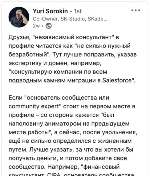 Если вы ищете работу и ваша целевая персона — работодатель, напишите свою актуальную должность. Если ваша целевая персона — это ваш покупатель, подумайте, с кем он сейчас больше захочет общаться: с продавцом, консультантом, доменным экспертом, техническим специалистом или с C‑level.