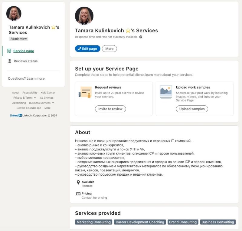 • Заполните раздел «Услуги» (Ser­vices). Относительно новая функция LinkedIn, которая позволяет даже задизайнить отдельную страничку для ваших услуг и добавить их описание с ценами в профиль + добавить видео, фото, презентации, которые иллюстрируют, как хорошо вы это делаете.