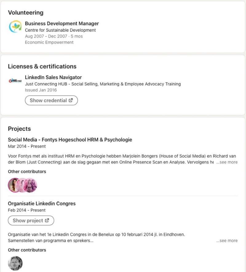 Это пример чужого профиля, где добавлены волонтерские проекты и сертификации. Такие графы редко встречаются в профилях, но могут сообщать много дополнительной информации о персоне