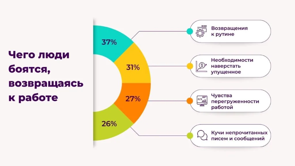 Среди того, что вызывает такую тревогу, участники опроса отметили, например, страх того, что ты пропустил важное решение, которое было принято во время их отсутствия. И потерю контроля над своими проектами. И срывание сроков по каким-то проектам. И просто «послеотпускную хандру».