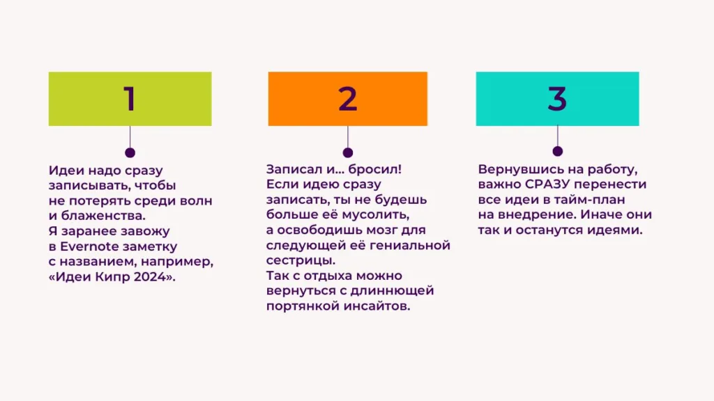Во время самого отпуска, даже если вам удалось выйти из рабочих чатов и заставить себя не проверять почту, вы всё равно можете чувствовать, что не вполне отвлеклись от работы. Больше того, именно тогда, когда голова начинает отдыхать и разгружаться от рутины, в неё иногда приходят настоящие озарения! Бывает и так, что тревожная мысль насчёт того, что надо что-то обязательно сделать, посещает нас в тот момент, когда мы это сделать физически просто не можем.