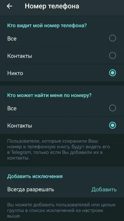 Идем в настройки — выбираем «Конфиденциальность» — «Номер телефона». В разделе «Кто видит мой номер телефона?» выставляем «Никто». В разделе «Кто может найти меня по номеру?» выставляем «Контакты». При таких настройках пользователь, который добавил ваш номер в свою телефонную книгу, не сможет найти вас и написать. В этом же разделе можно добавлять исключения — людей, которые будут всегда видеть ваш номер телефона. Пользуйтесь этой функцией с осторожностью.