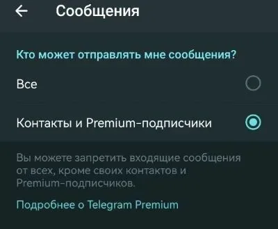 Также владельцы Telegram Premium могут ограничить и пересылку сообщений. Для этого в разделе «Сообщения» выбираем пункт «Контакты и Premium-подписчики».
