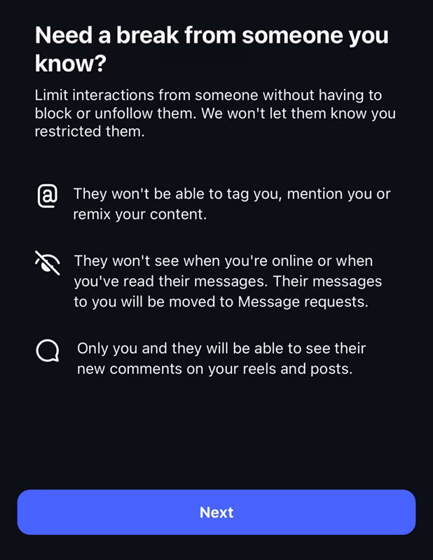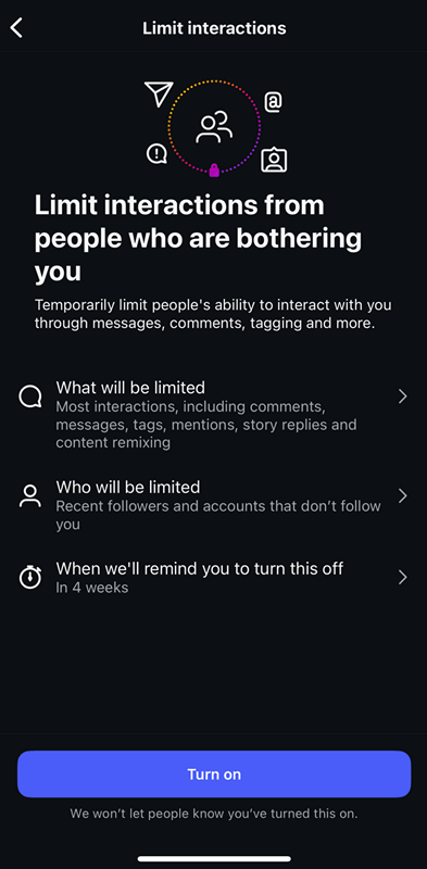 «Ограничение интеракций» — пожалуй, самая полезная фича Инстаграм по защите от кибербуллинга и спланированных массовых атак. Если вы понимаете, что вас ждет «шторм», просто включаете тумблер под названием «Ограничить действия людей, которые вам досаждают».