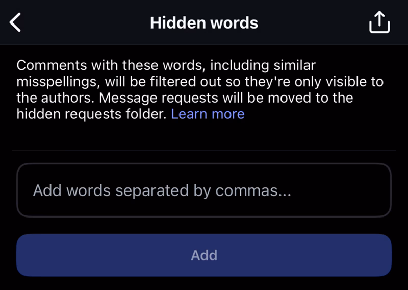 Еще одна полезная функция — «Hidden Words» (Скрытые слова). Она пригодится, если вас регулярно посещают боты и пишут однотипные комментарии по методичке. Достаточно понять, какие ключевые слова используют боты; и напечатать их, разделяя запятыми, в соответствующий блок в «Настройках и активностях» (Settings and Activity). Также можно заранее добавить туда самые частые оскорбительные и триггерные слова, которые могут использовать против вас.
