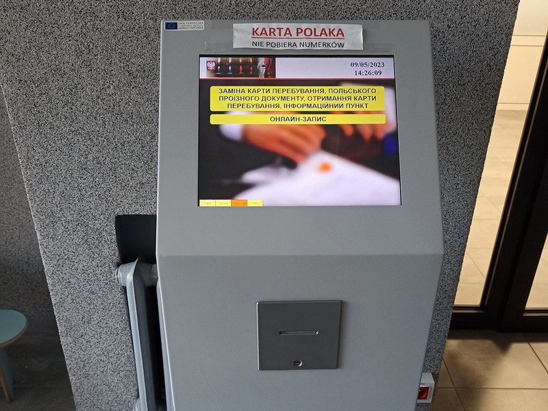 Через три недели я пришёл в ужонд за полчаса до назначенного времени. Войдя в здание нужно пройти немного вперёд и повернуть направо — там находится пункт обслуживания иностранцев. В фойе стоит автомат, который выдаёт талончики — для этого нужно ввести код, который вы получили при регистрации на сайте.