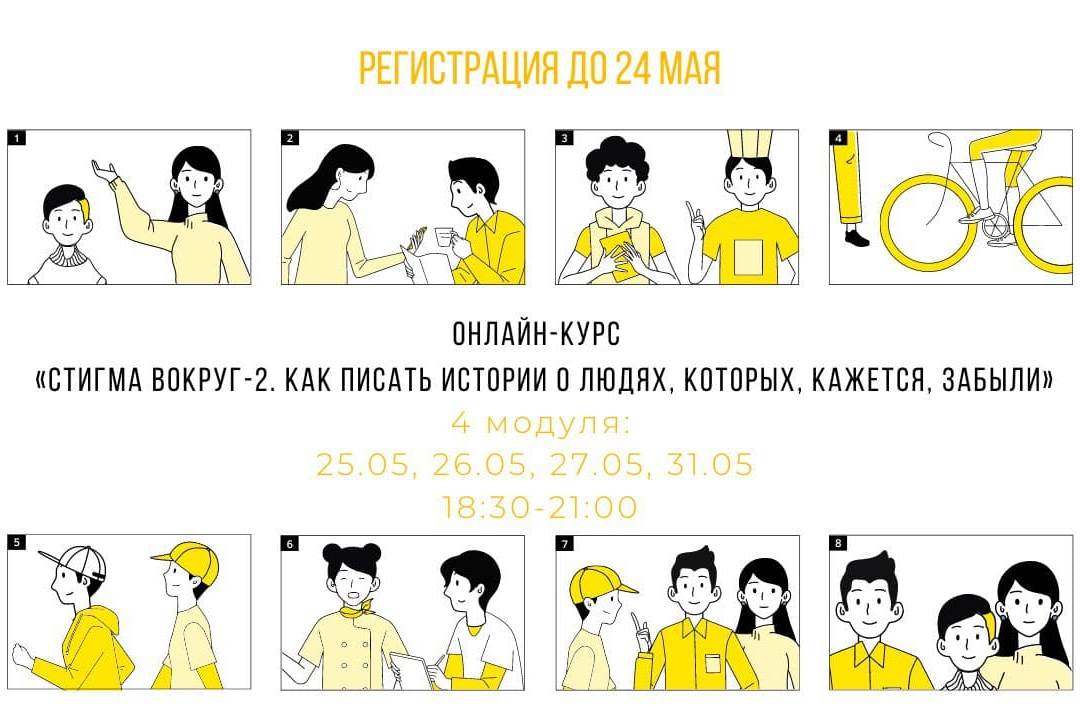 Краш-курс «Стигма вокруг. Как писать истории о людях, которых, кажется, забыли» состоит из 4 тренинговых онлайн-модулей на платформе в ZOOM по 2,5 часа каждый: 25, 26, 27 и 31 мая с 18.30 до 21.00.