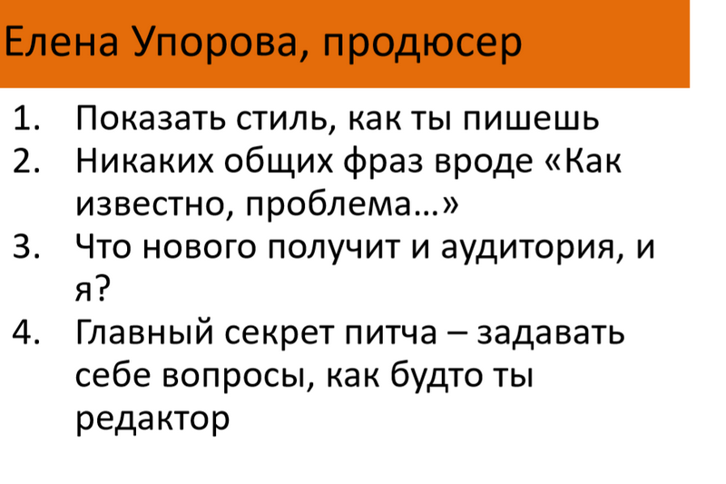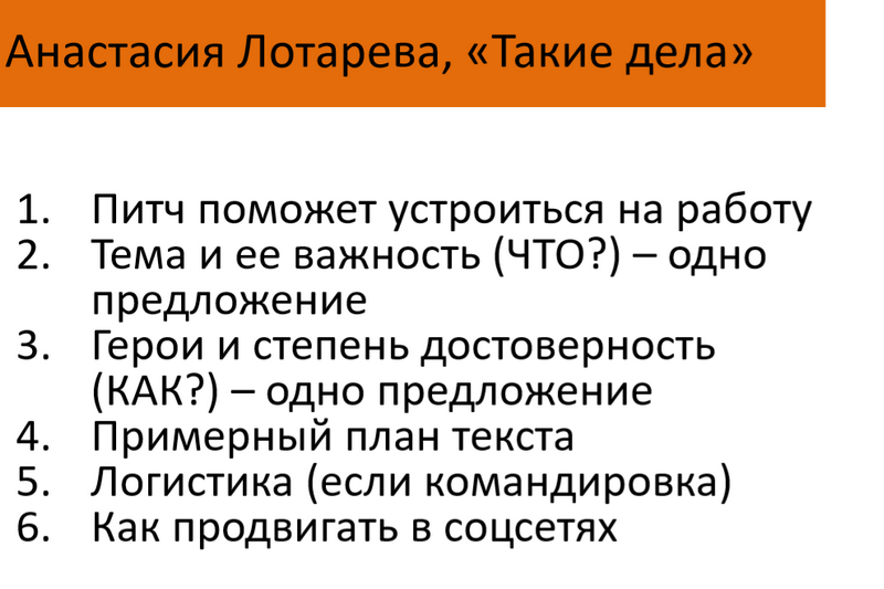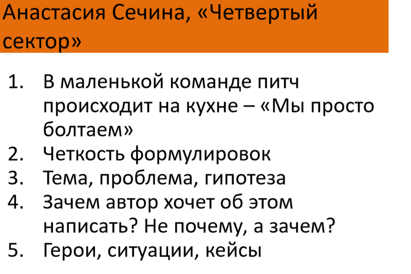 Также Анастасия – за короткие питчи, которые можно прочесть по диагонали и сразу понять, про что речь и стоит ли за тему браться.