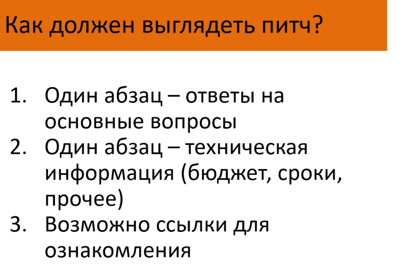 Питч – это короткое описание будущей статьи / будущего проекта с указанием идеи, ракурса, потенциальных героев, затрат…, которое журналист представляет редактору.