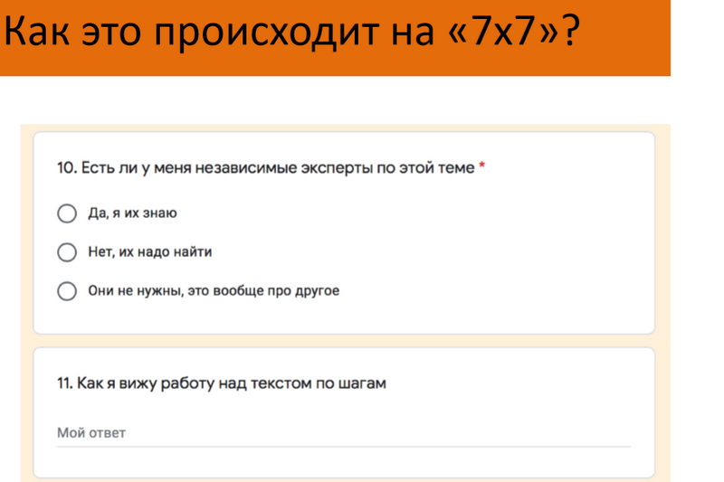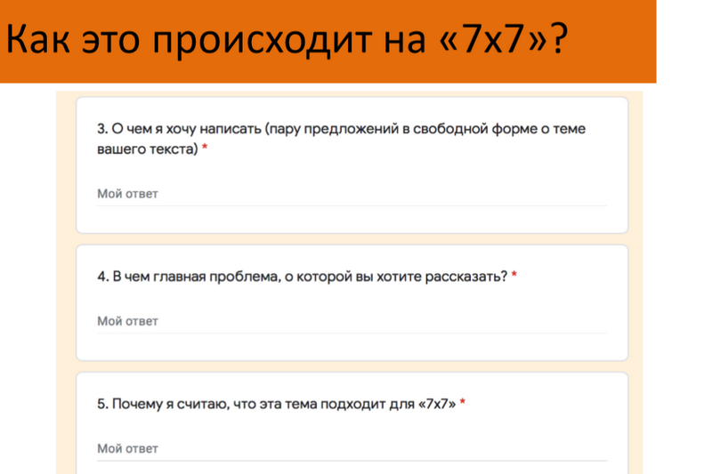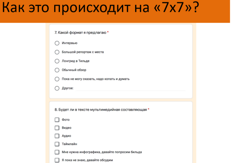 Изначально описания-питчи тем приходили в виде обычных писем на имейл редакции «7х7». Но с недавнего времени редакция перешла на гугл-форму. Это помогло оптимизировать процесс и сократило время на поиск нужных тем и писем в редакционной почте.