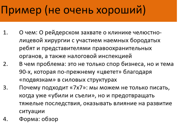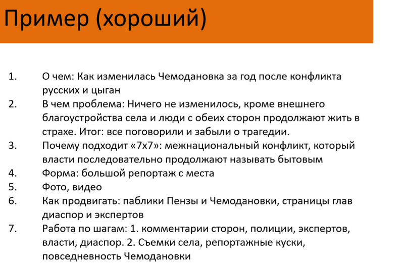 Почему не очень удачный? Человек не учёл формат и специфику подачи материалов в «7х7», а также изначально выбрал не тот стиль описания (такой стиль больше подходит для «СПИД-инфо»). Если бы автор питча выбрал иной ракурс и по-другому подал эту тему (потому что в ней есть потенциал), её бы наверняка утвердили.