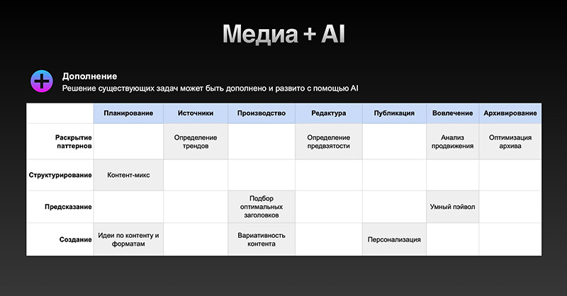 Наршэце, штучны інтэлект можа стаць добрым кансультантам для рэдактара. Эксперт бачыць вялікі патэнцыял у выкарыстанні нейрасетак пры будаванні бізнэс-працэсаў унутры рэдакцыі. З дапамогай ШІ можна эканоміць рэсурсы, каб накіраваць іх на падрыхтоўку больш цікавага і складанага кантэнту.